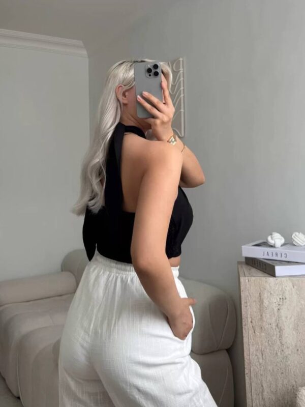 Top koji spaja trendovski halterneck kroj i funkcionalnu elastičnost, savršen za dnevne izlaske, festivalske outfite i sofisticirane ljetne kombinacije.