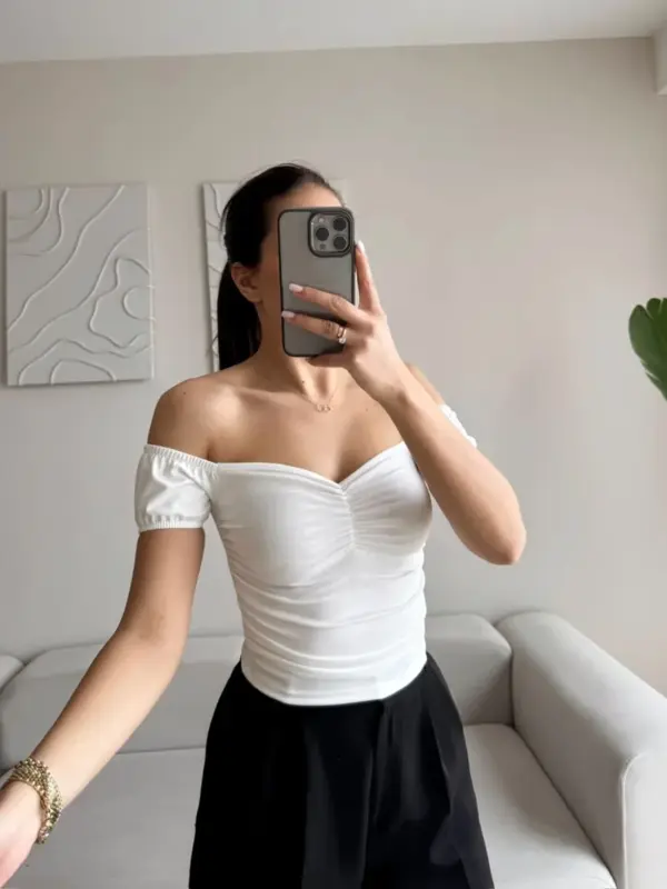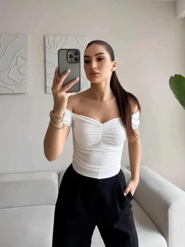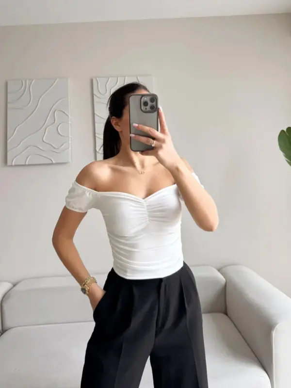 🔹 Kroj: Top s otkrivenim ramenima, kratki rukavi, uzak kroj