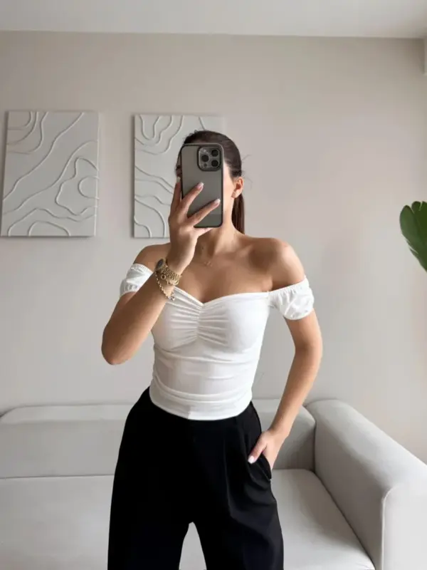 🔹 Kroj: Top s otkrivenim ramenima, kratki rukavi, uzak kroj