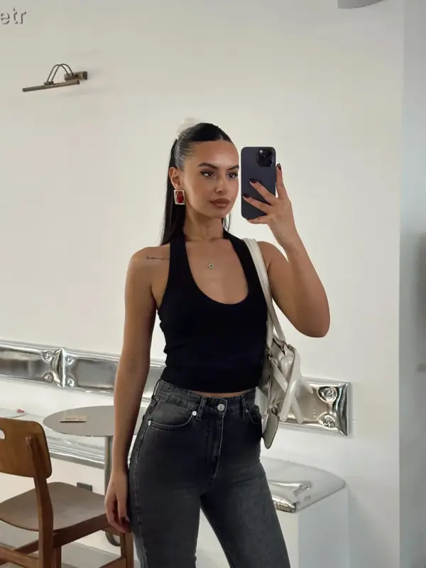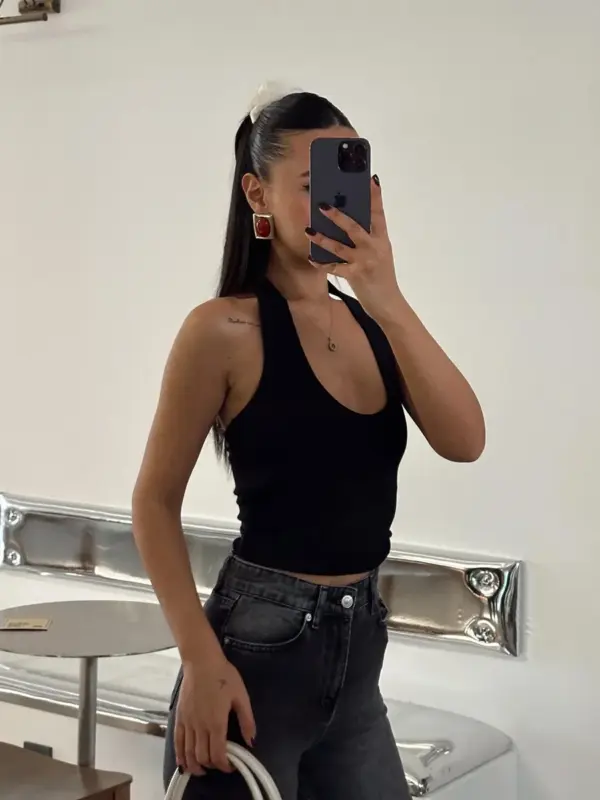 Praktičan i udoban, ovaj model izrađen je od prijatnog, elastičnog materijala koji se lako prilagođava tijelu, dok jednostavan kroj i otvorena leđa daju dozu suptilne elegancije. Nosiv uz sve – od šortsa i suknji do pantalona.