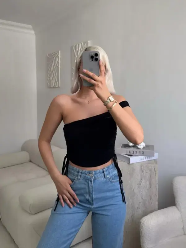 Glavni detalj su vezice sa strane koje omogućavaju podešavanje dužine i stvaranje drapiranog efekta. Ovo vam daje slobodu da prilagodite top svom stilu i prilici. Savršen je za večernje izlaske i casual varijante kada želite izgledati jedinstveno.