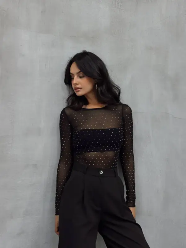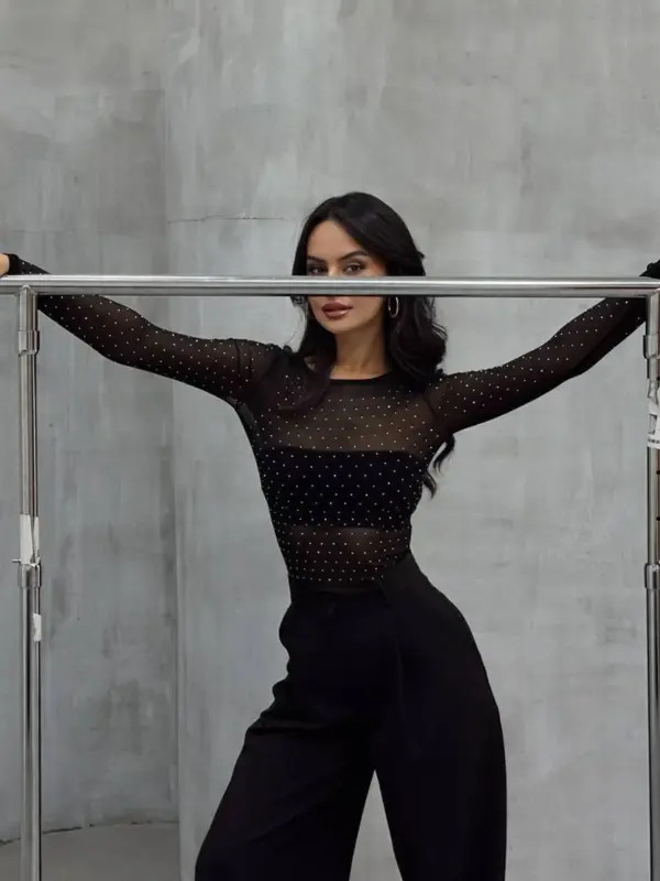Dodaj dozu sjaja i odvažnosti svom outfitu s ovim efektnim mrežastim topom! Napravljen od lagane, elastične mreže, top je potpuno providan i ukrašen sitnim cirkonima s prednje strane koji hvataju svjetlost i čine svaki tvoj pokret zapaženim.