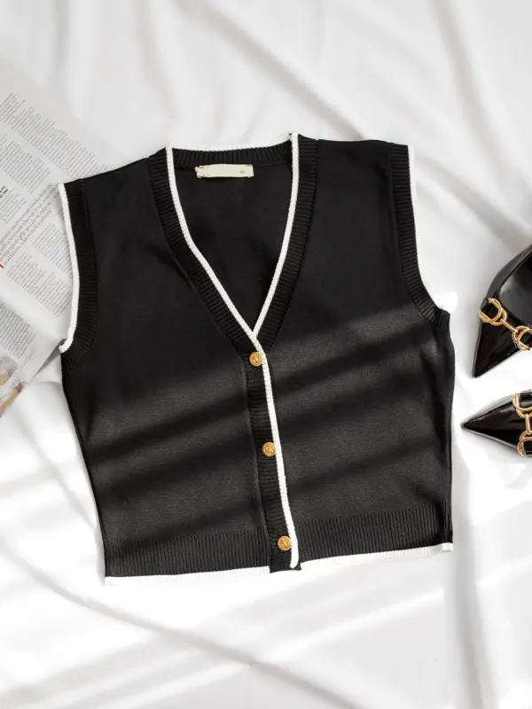 Kontrastni široki top u stilu prsluka s V izrezom. Kopčanje gumbima zlatne boje sprijeda.