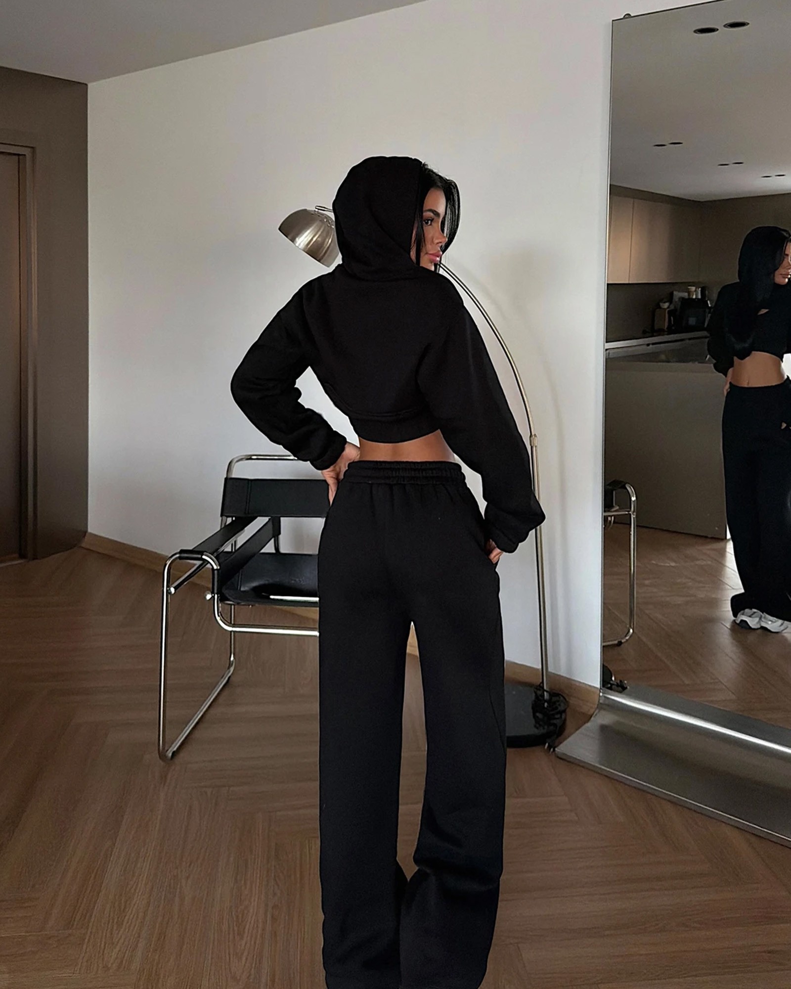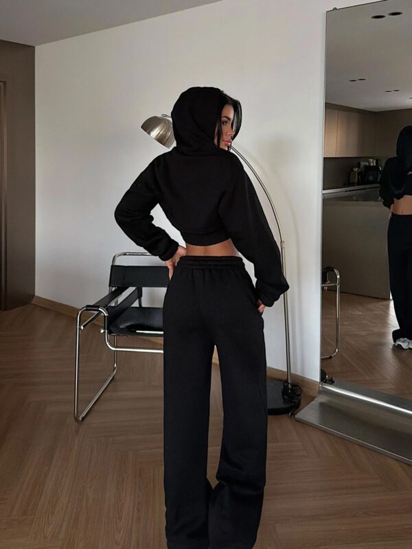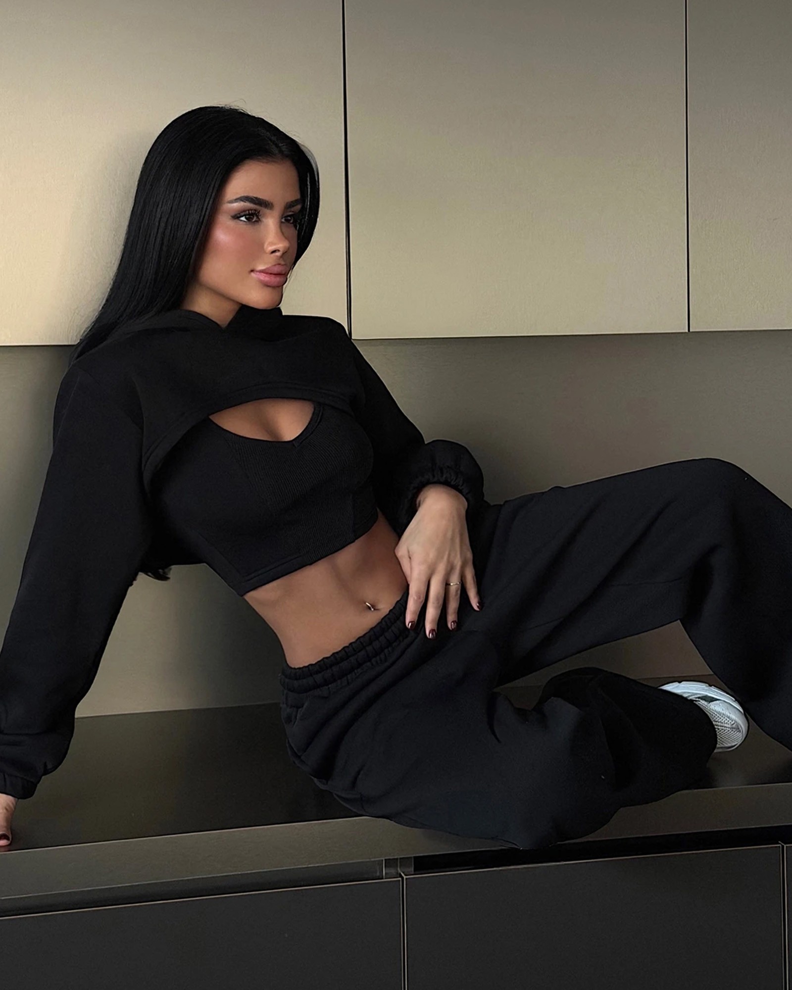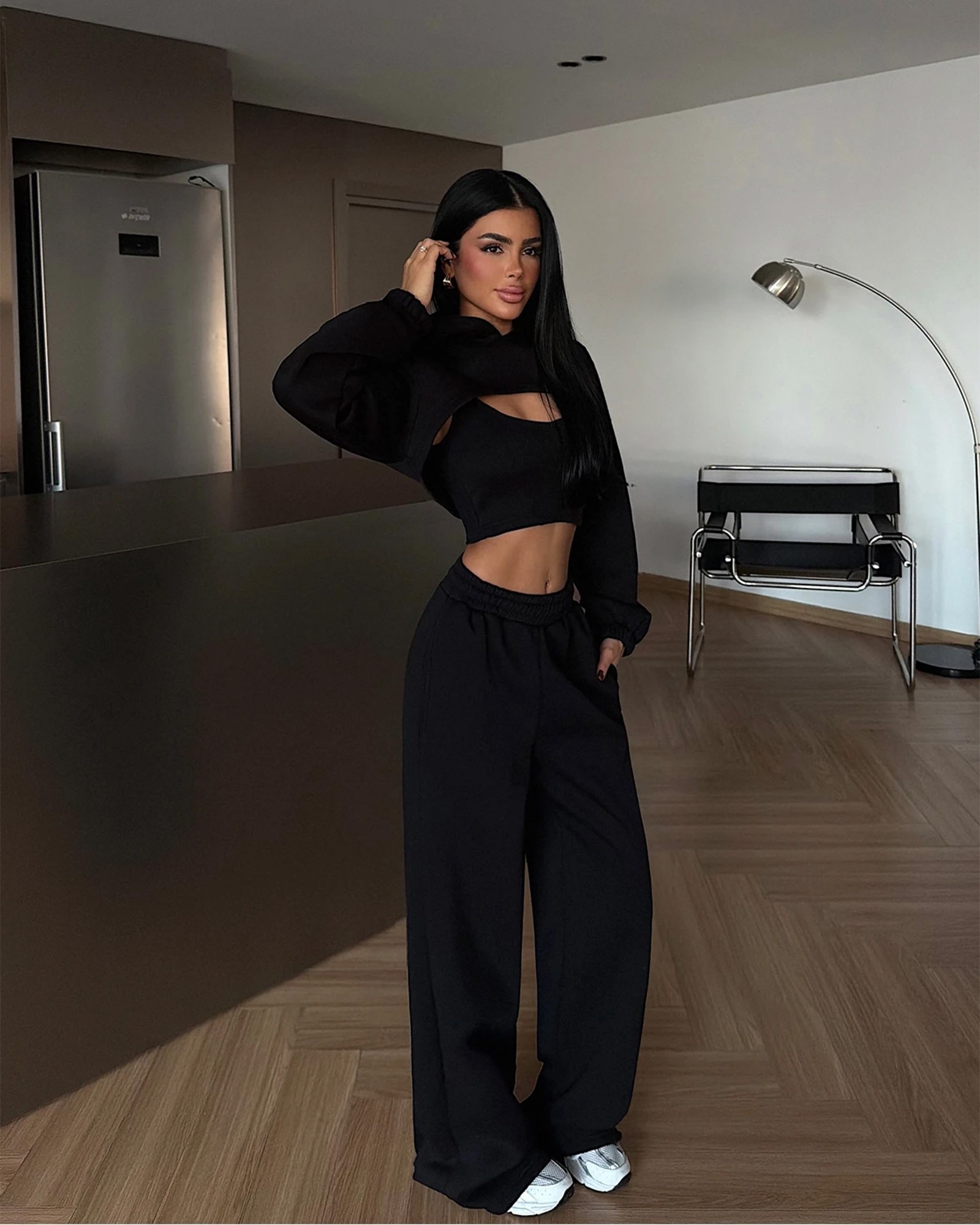Set se sastoji od crop duksa s kapuljačom, kratkog topa i širokih pantalona s gumom u struku.