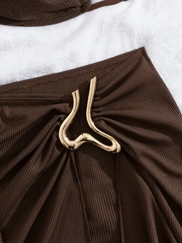 Istakni se na plaži uz ovaj elegantni trodijelni kupaći kostim! Set uključuje top s ukrasnom metalnom kopčom i podesivim naramenicama, klasične donje gaćice i trendi pareo suknjicu s istim detaljem – savršena kombinacija stila i funkcionalnosti. Uklonjive spužvice omogućuju dodatnu udobnost i prilagodbu.