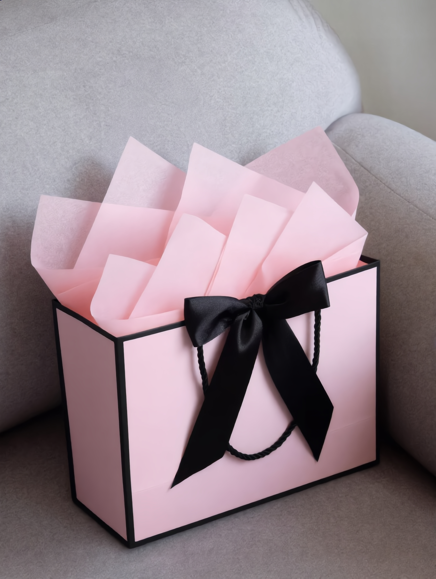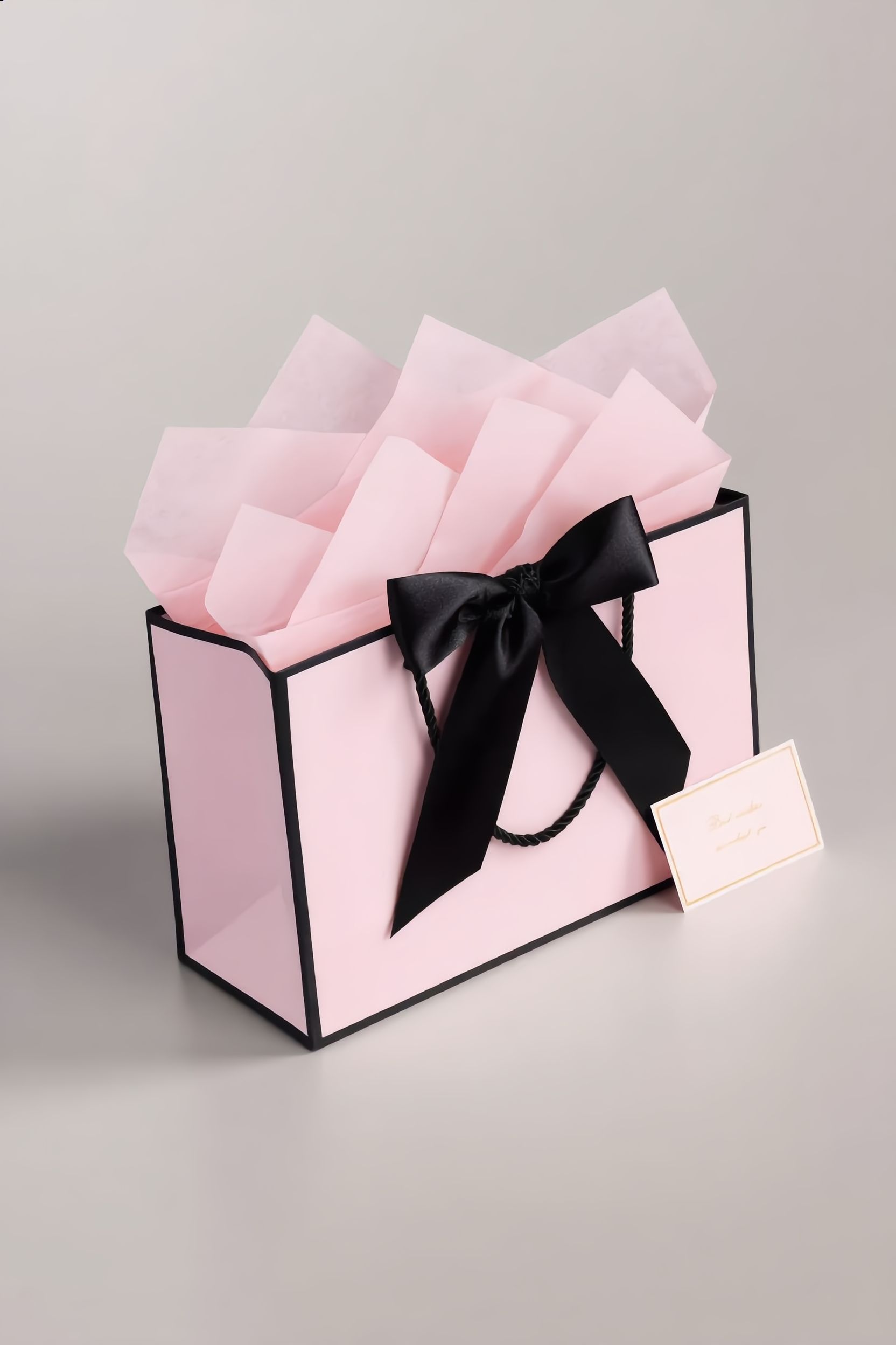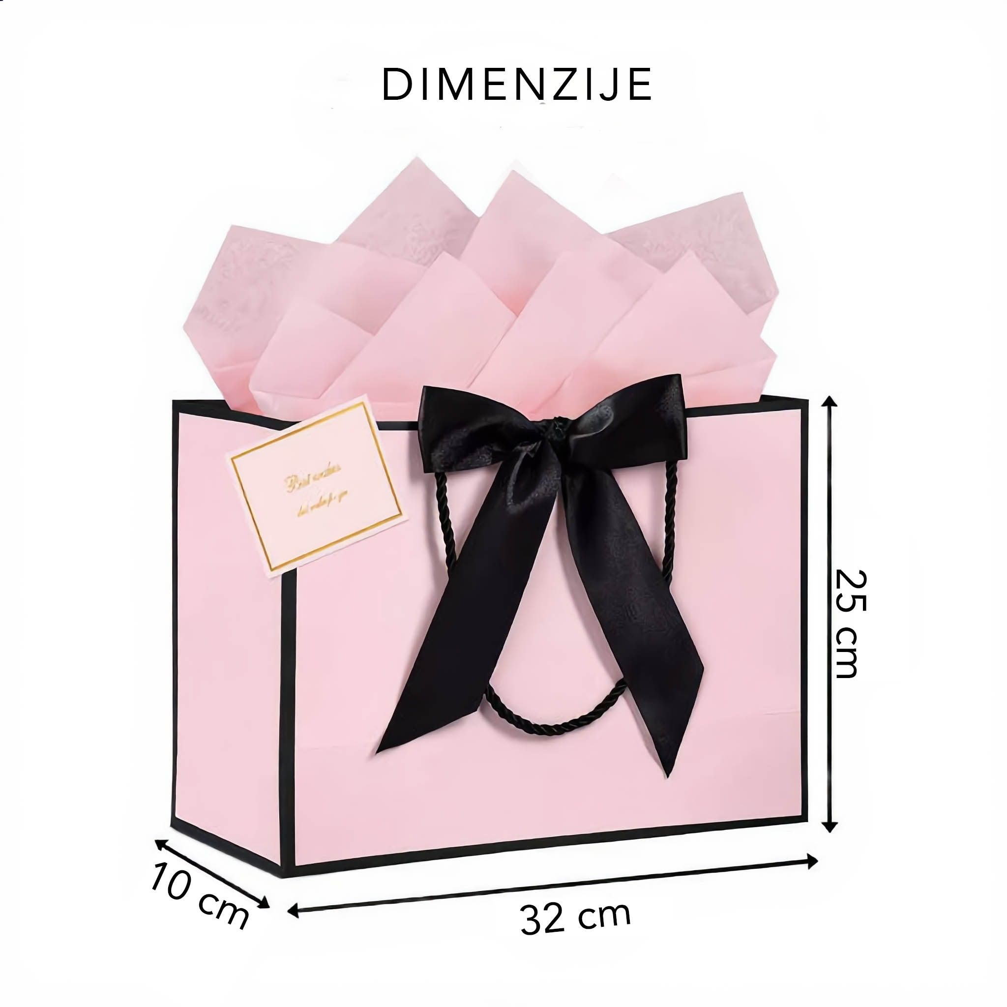 Ova elegantna poklon-kesa s ručkom i dekorativnom mašnom savršen je izbor za pakovanje poklona za različite svečane prilike. Minimalistički i čist dizajn čini je univerzalnom i lako uklopivom uz svaku temu događaja – od intimnih proslava do formalnih svečanosti.